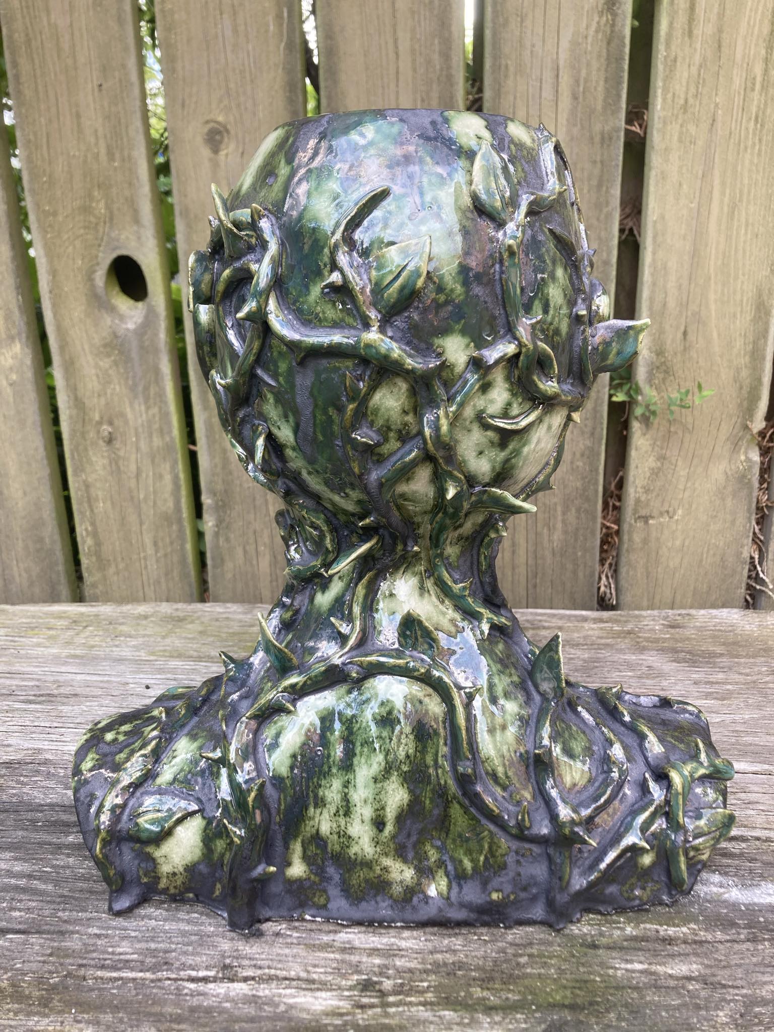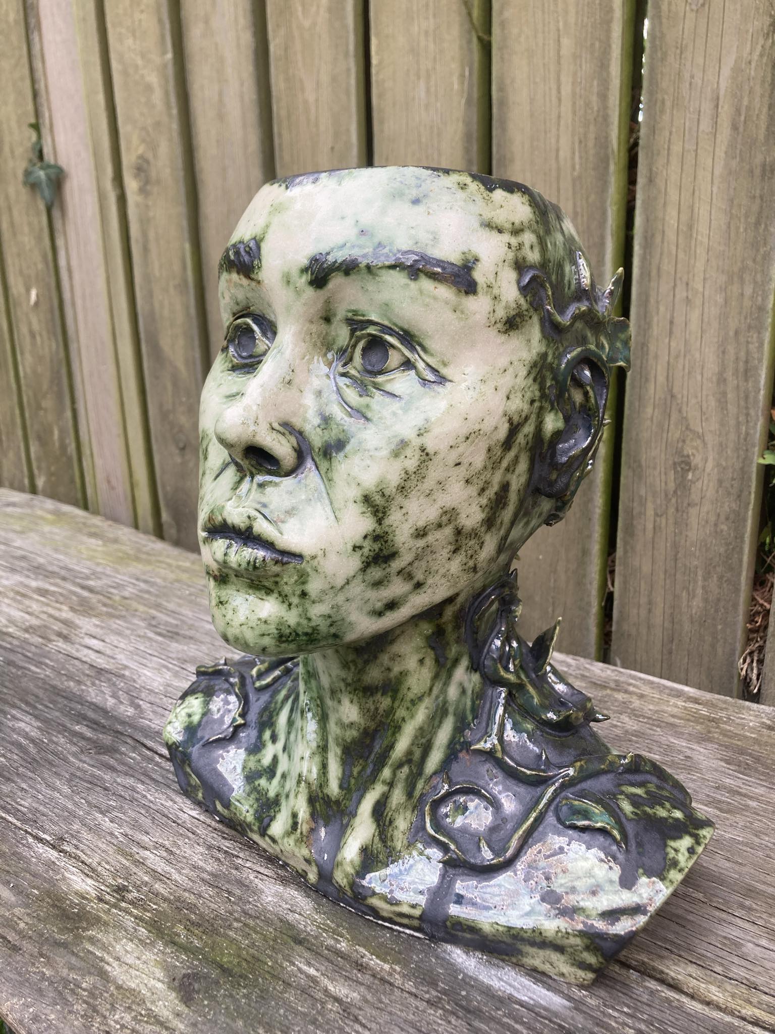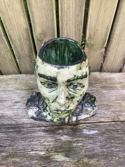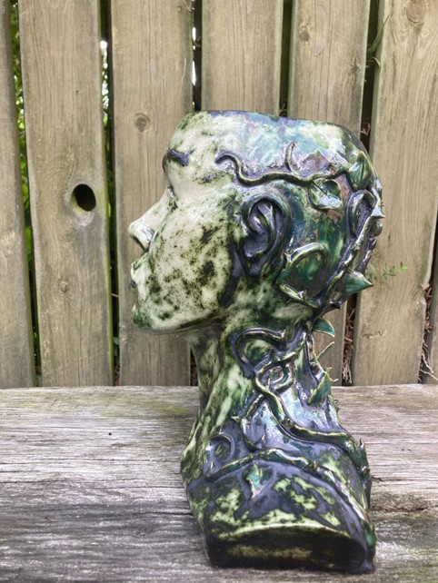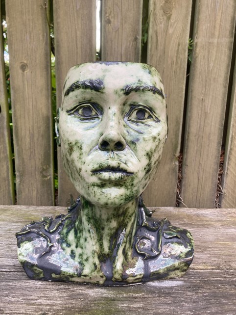 Byste, 30x29x20cm, lertøj glaseret med kobberoxid, Freja Franciska Lehnert f. 2003