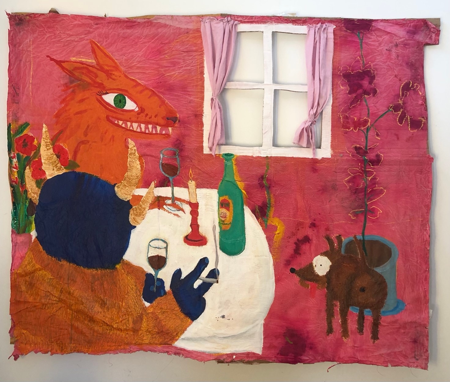 På date med Tina, 167x127cm, akryl, oliekridt og stof, akryl indfarvning på lærred, på pap, Anna Møller f. 2002