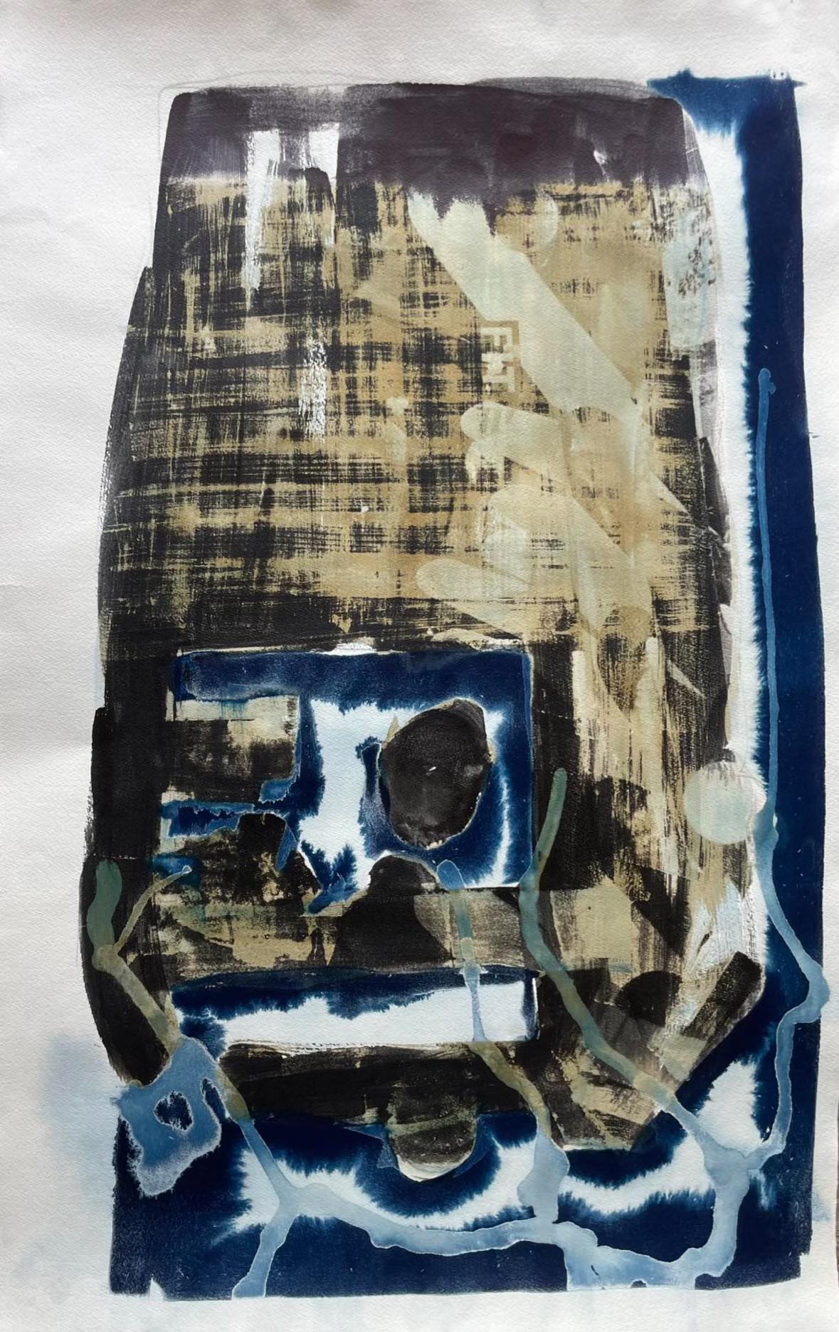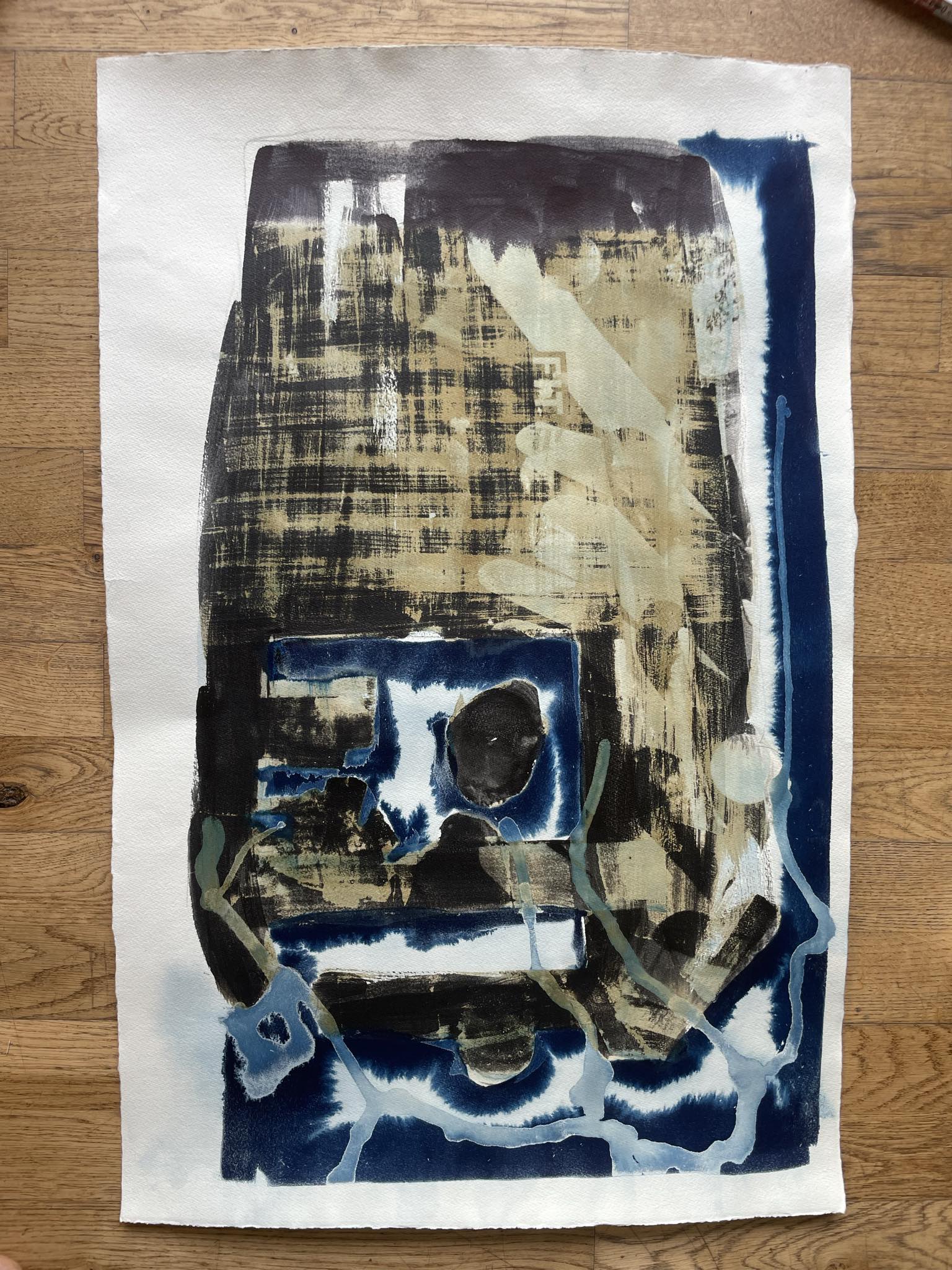 Rumstationen, 77x50cm, liquid light, cyantopi, fremkalder væske på bomuldspapir, Elias Kongsted Misander f. 2002